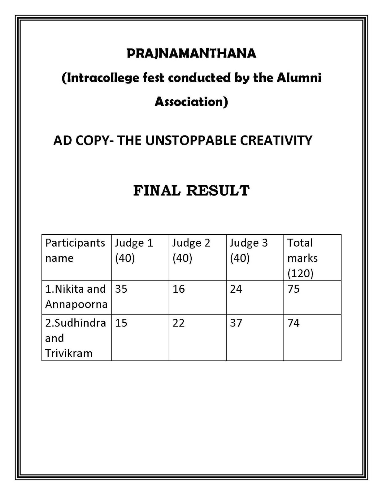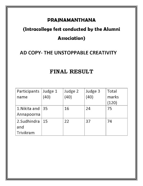 Programs sponsored by the Alumni Association of PIM was conducted by a team of co-ordinators namely Ms.Niveditha Karanth, Ms.Ankitha Padmanabha Rao and Mr.Nishanth D’souza with the guidance given by Mrs. Diana Saldanha, the secretary of the alumni association and Ms. Sanjana Ninjoor, alumna of PIM.  Staff co-ordinator Mrs.Bharathi Karanth along with the Placement coordinator Mr.Shivanand Bhandarkar and the faculty memeber Mr.Joe Ashwin Correa effectively guided the students along with the overall guidance given by Dr.Bharath V the Director of PIM. Six events namely quiz, paper craft, adcopy, shortfilms,treasure hunt and best manaager were conducted under the banner of alumni association.  Mr.Rahul Kunder assisted in judging adcopy and short films along with the internal faculty memebers of the institution while Ms.Preetha Mairpady , Ms.Meenakshi Acharya alumni of PIM assisted by judging the other events.