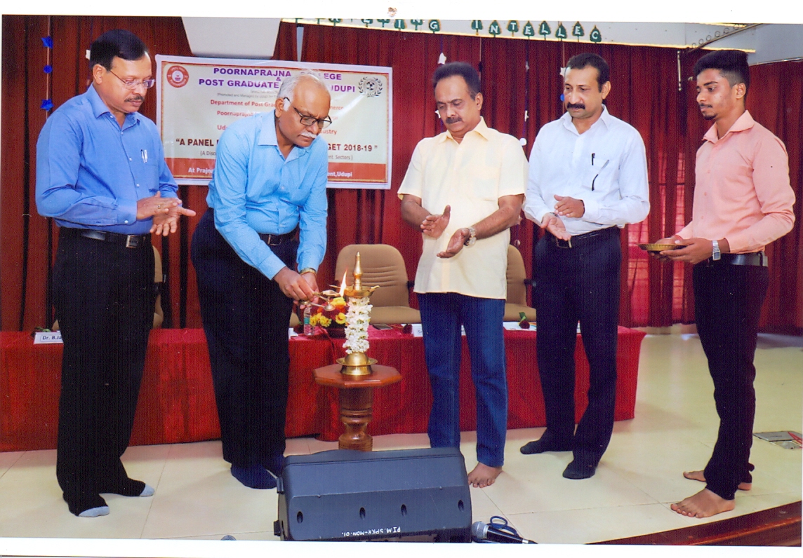 Poornaprajna Institute of Management was witness to a spectacular intellectual programme on Union Budget 2018-19 which was organised in association with Udupi chamber of Commerce and Industry.  Mr.Shrikrishna Kodancha , the President of Udupi Chamber of Commerce and Industry was the Chief guest of the programme.  A panel consisting of experts in various segments of the society was formulated .  The panel consisting of practicing chartered accountants, legal experts, experts in the area of economics, rural development etc.  The panel discussed the impact of union budget 2018-19 on the different sectors like industrial development, agricultural development, infrastructure, taxation aspects etc.  CA M.Sridhar Kamath opined that the government is focussing on structural changes and thereby intends to provide solutions to the problems in the long term. It is not focussing on providing short term remedies to become popular.  Dr. Ganesh Bhat coordinated the whole programme.  The faculty members, students of both MBA and MCom attended the session and participated in the discussions.
