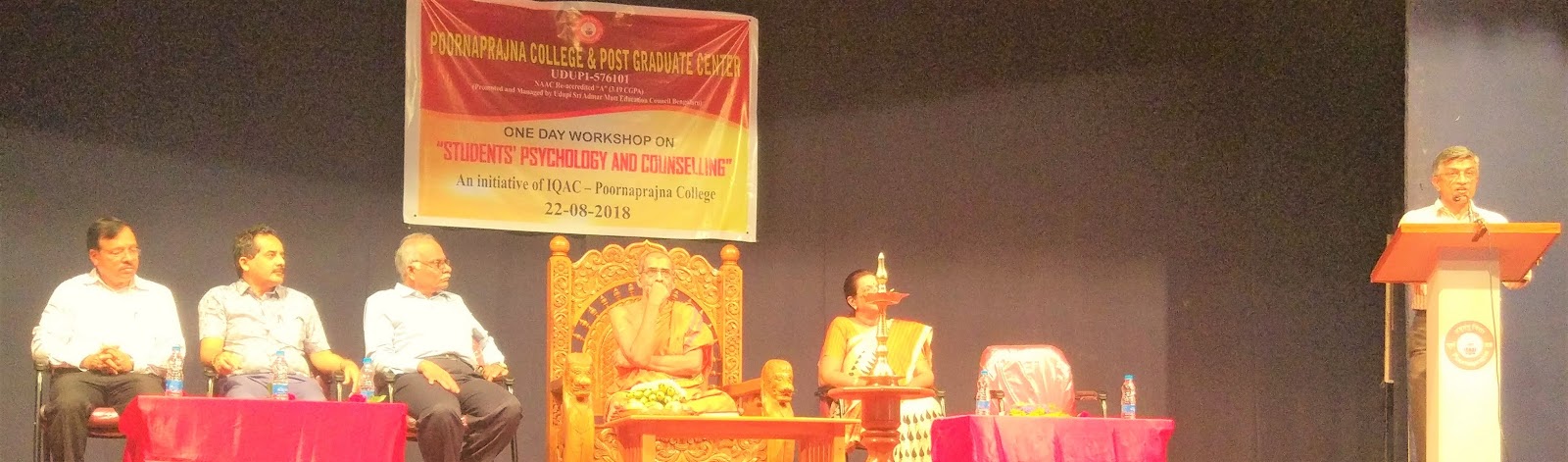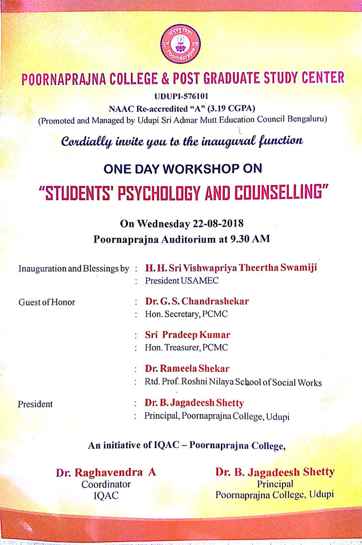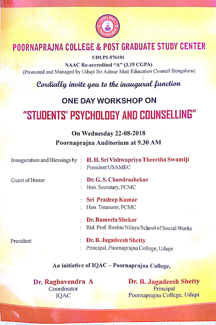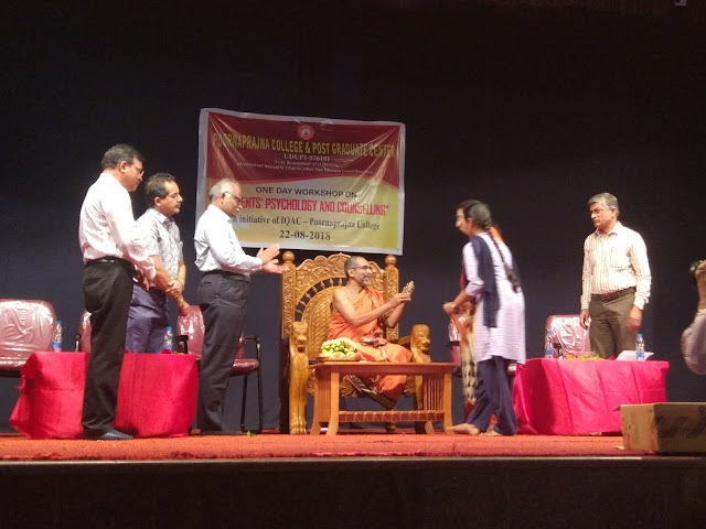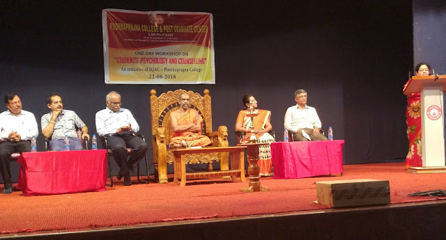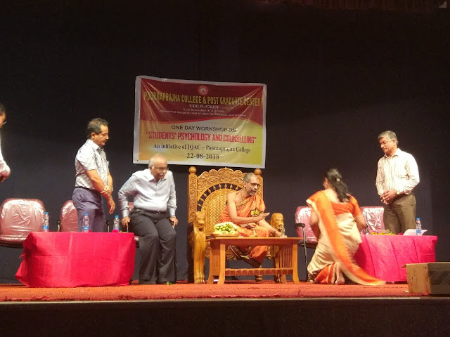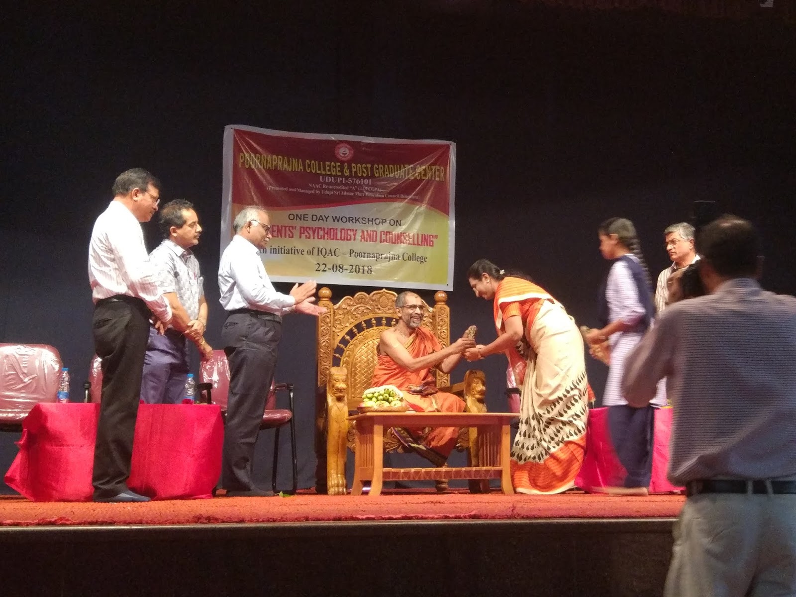 All the faculty of Poornaprajna Institute of Management participated in one day workshop on Students Psychology and Counselling, held at Poornaprajna Auditorium on Wednesday 22 – 08 – 2018. Dr. Rameela Shekar, Rtd. Professor Roshini Nilay, School of Social Works, Mangalore came as Resource Person. The programme was inaugurated by His Holiness Sri Vishwapriya Theertha Swamiji, President of Sri Admar Mutt Education Council. Dr. G, S Chandrashekar, Hon. Secretary of PCMC and Sri Pradeep Kumar, Hon. Treasurer, PCMC were Guest of Honor. Sri Jagadeesh Shetty, Principal of the College was also present on this occasion. Dr. Raghavendra, IQAC Coordinator introduced the guest. Ms. Jayalakshmi compered the programme.