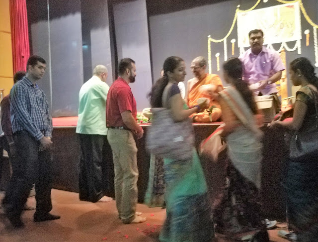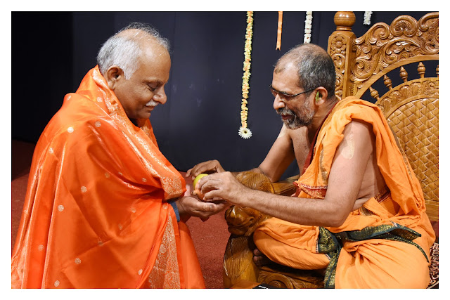 | Prof. Ashwin and Prof. Bhandarkar receiving sweets from Swamiji |
