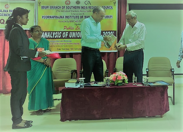 Udupi Branch of Southern IndiaRegional Council (The Institute of Chartered Accountants of India) in association with Poornaprajna Institute of Management, Udupi organised a public lecture on the topic, “Analysis of Union Budget – 2020” at Prajna Hall of Poornaprajna Institute of Management. His Holiness Sri Sri Vishwapriya Theertha Swamiji, President, Admar Mutt Education Council inaugurated the programme and gave his blessings. CA Vishnumoorthi H, Partner, Vishnu Daya & Company, LLP, Bangalore was the resource person. C A Narasimha Nayak, President of Udupi Branch of Southern India Regional Council welcomed the guests. Mr. Abhaya Nayak of II Year MBA introduced CA Vishnumoorthi H. Miss Canis Second Year MBA student of Poornaprajna Institute of Management compered the programme. Dr. Bharath V, Director of the Institute proposed a vote of thanks. Dr. Bharathi Karanth, Associate Professor coordinated the programme. CA Kavitha M Pai T, Secretary of Udupi Branch of Southern India Regional Council was present on the stage during the function. Miss Abja and her team rendered prayer. All the students and faculty of Poornaprajna Institute of Management and students from other colleges, members of the public and chartered accountants affiliated to Udupi Branch of Southern India Regional Council were present on this occasion.