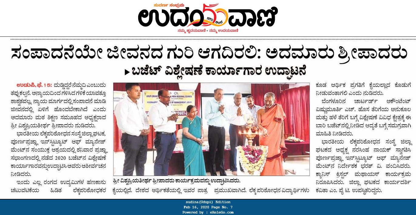 Udupi Branch of Southern India Regional Council (The Institute of Chartered Accountants of India) in association with Poornaprajna Institute of Management, Udupi will organise a public lecture on the topic, “Analysis of Union Budget – 2020”. Inauguration and blessings by His Holiness Sri Sri Vishwapriya Theertha Swamiji, President, Admar Mutt Education Council. CA Vishnumoorthi H, Partner, Vishnu Daya & Company, LLP, Bangalore will be the resource person. All are cordially invited